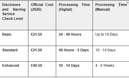 Note on Admin Fees: While the government fees are as above, most employers use an "Umbrella Body" which adds an administration fee (usually £5–£15). Total costs may vary based on these admin fees.